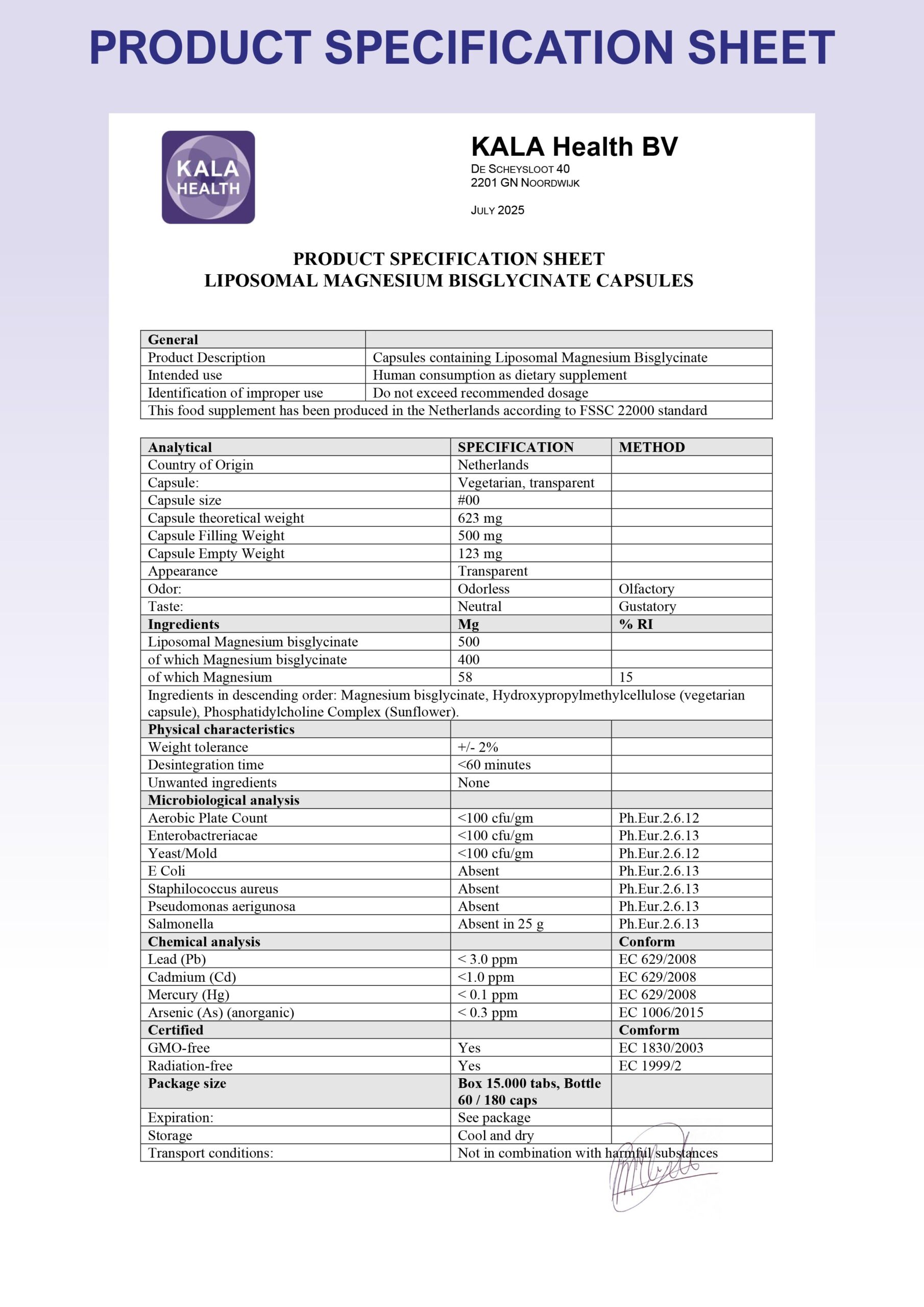 - Hooggedoseerd liposomaal bisglycinaat: 500 mg per capsule, met 80% actief magnesium bisglycinaat.