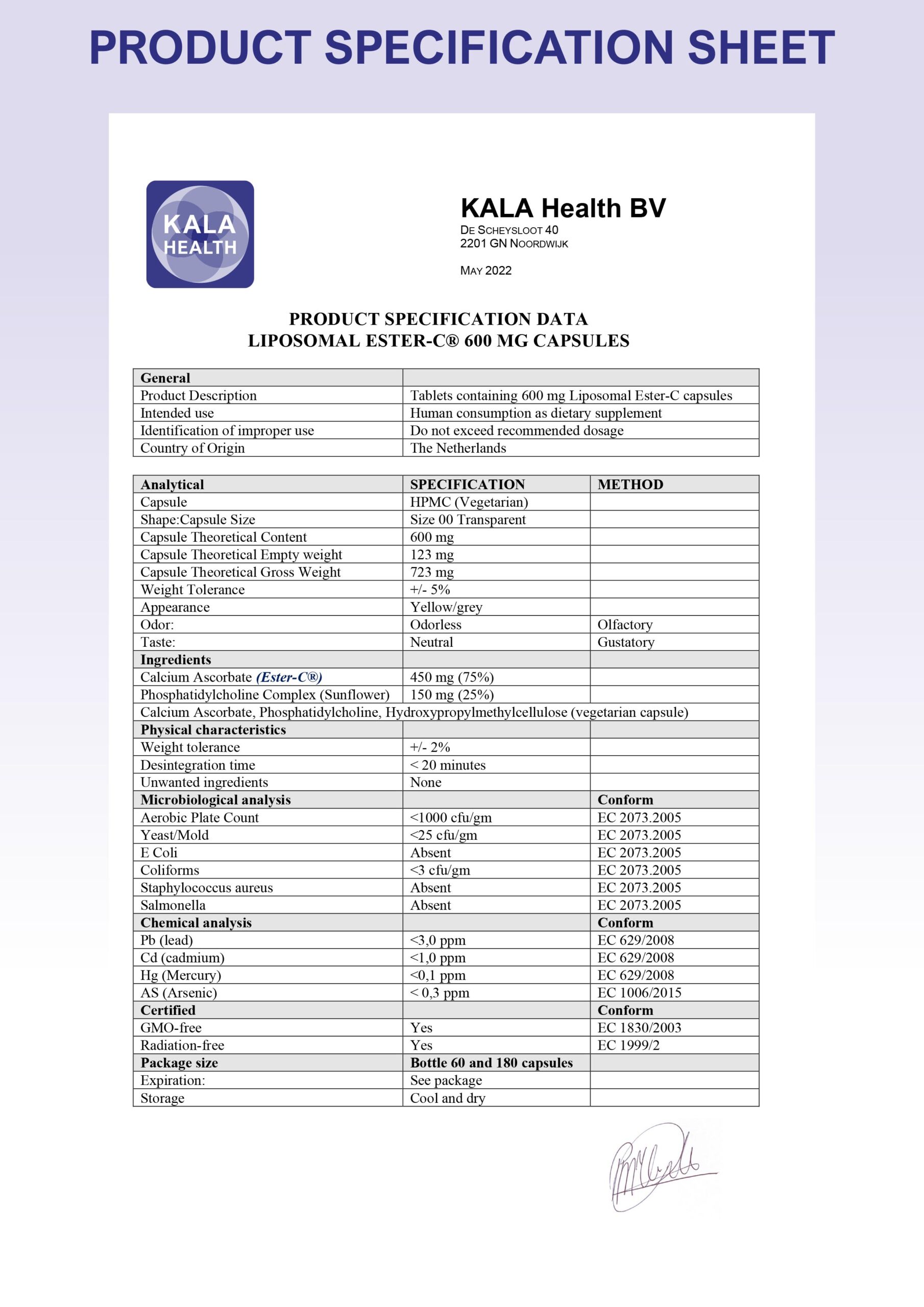 - Zuivere formule: Ester-C® fungeert als eigen drager voor de liposomen