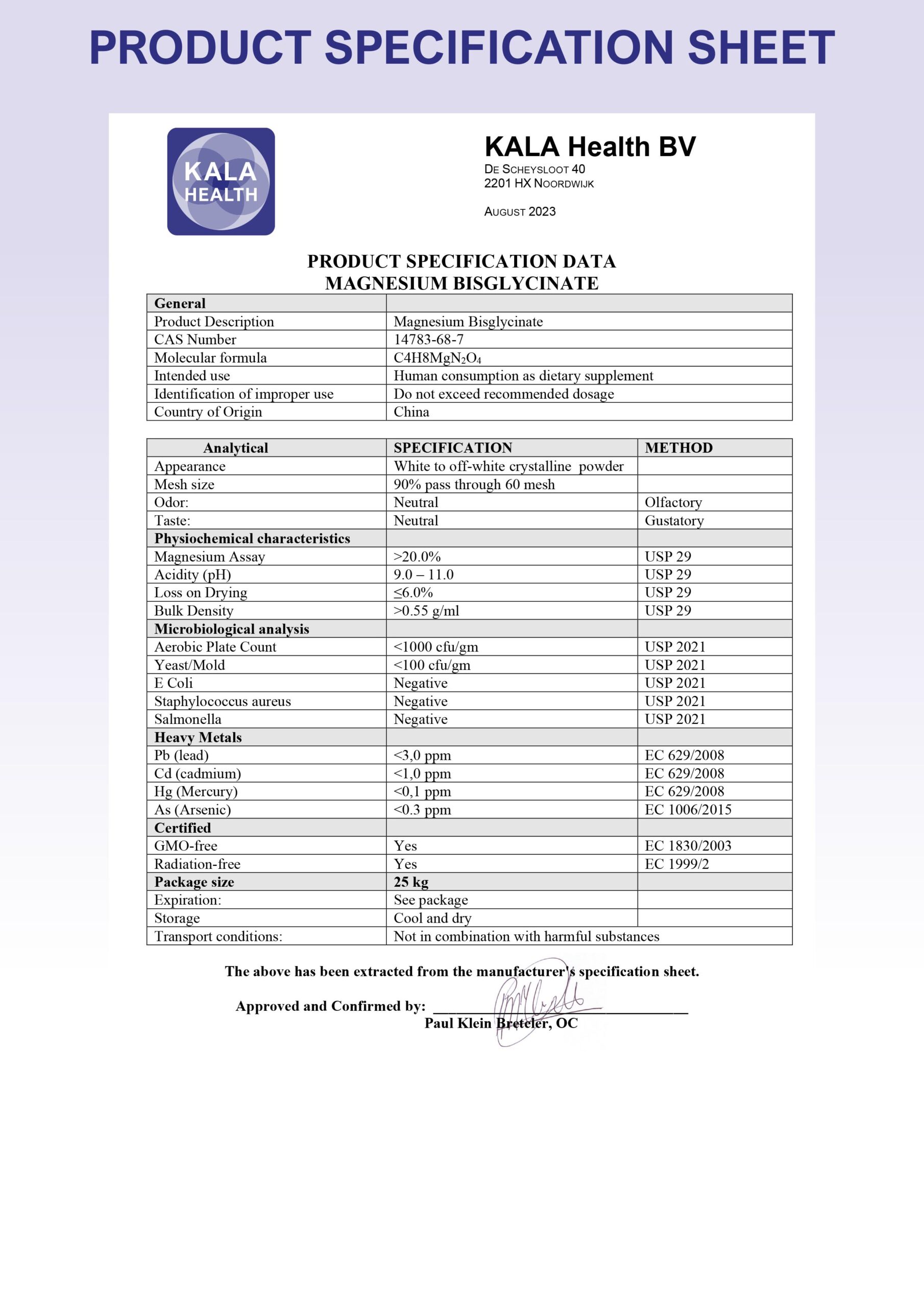 Kala Health is opgericht in 1997 door Paul Klein Breteler. Ons Magnesium Bisglycinaat Poeder is door Paul persoonlijk geformuleerd. De keuze voor 20% elementair magnesium in plaats van de standaard 14,4% is een bewuste formulatiekeuze om de klant meer actieve magnesium per dosering te bieden, zonder concessies te doen aan verdraagzaamheid.