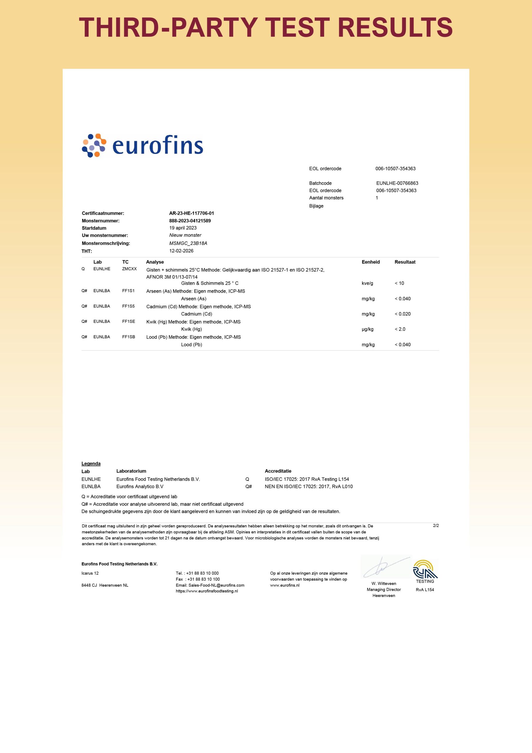 - Uitgebreid getest – op zware metalen en microbiologische zuiverheid in onafhankelijk laboratorium