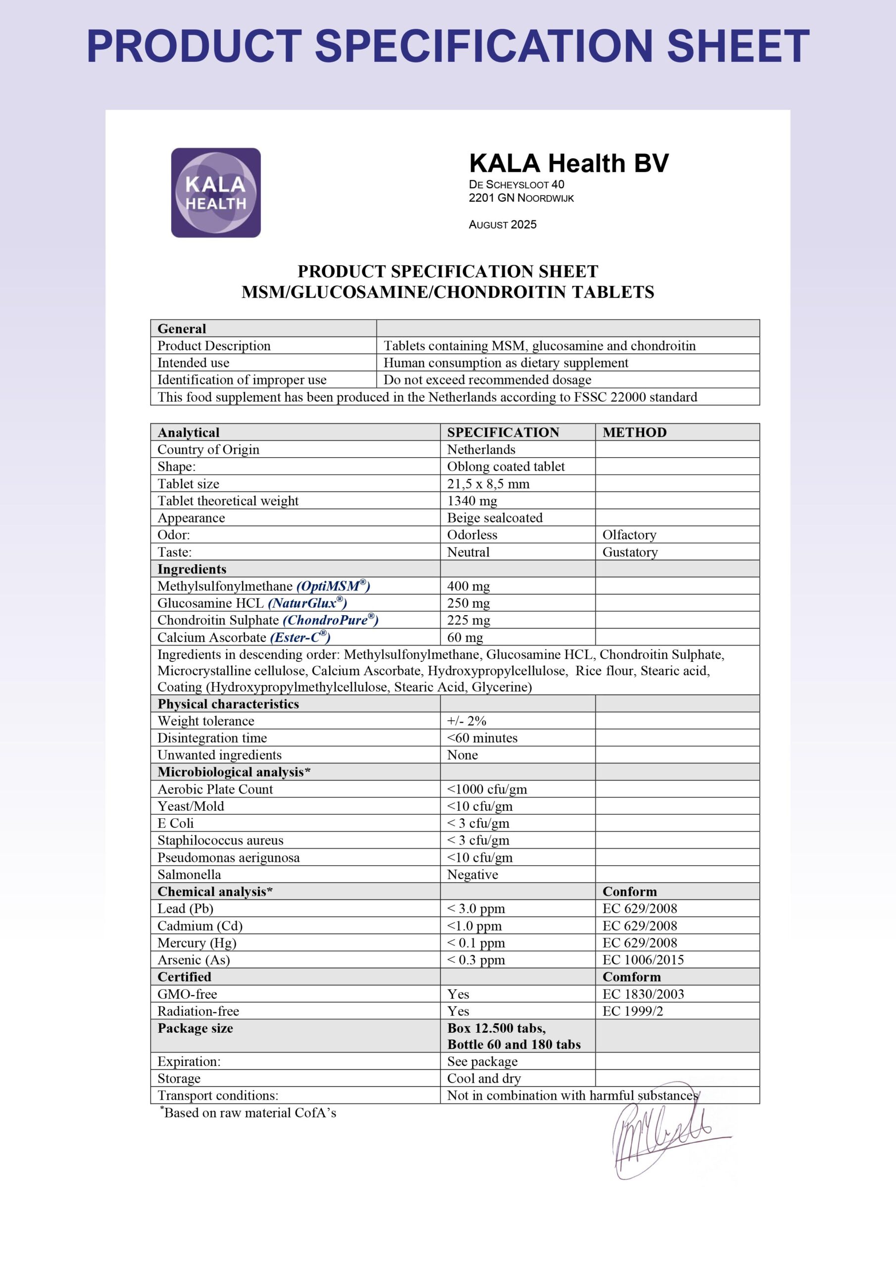 Ingrediënten: Methylsulfonylmethaan (OptiMSM®), glucosamine-HCl (NaturGlux®, uit maïs), chondroïtinesulfaat (ChondroPure®, uit rundertrachea), microkristallijne cellulose (vulstof), calciumascorbaat (Ester-C®), hydroxypropylcellulose, rijstmeel, stearinezuur, coating (hydroxypropylmethylcellulose, stearinezuur, glycerine).