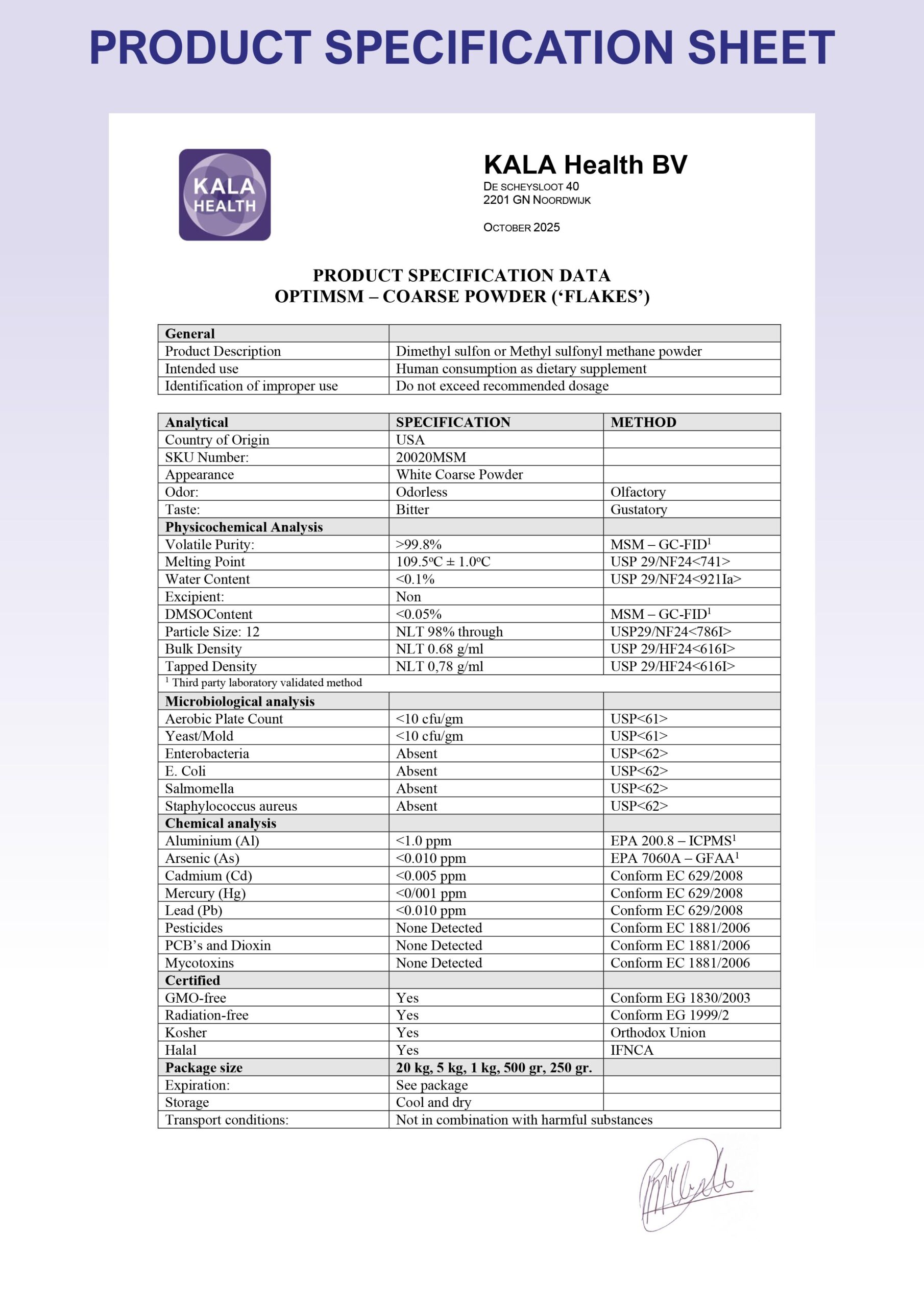 Wat ons wellicht het meest onderscheidt is de combinatie van productie-expertise en therapeutische ervaring. Paul Klein Breteler, oprichter en productontwikkelaar van Kala Health, is sinds de jaren tachtig persoonlijk betrokken bij de formulering en kwaliteitscontrole van ieder OptiMSM® product. In vier decennia hebben wij niet alleen duizenden klanten begeleid, maar ook intensief samengewerkt met therapeuten, artsen en voedingsdeskundigen die MSM in hun praktijk toepassen. Die ervaring vloeit terug in alles wat wij doen: van de formulering van onze producten tot het persoonlijke advies dat u van onze specialisten ontvangt wanneer u belt of mailt. Het complete Product Specification Sheet met alle technische specificaties, laboratoriumanalyses en certificaten kunt u inzien in de productgalerij op deze pagina.