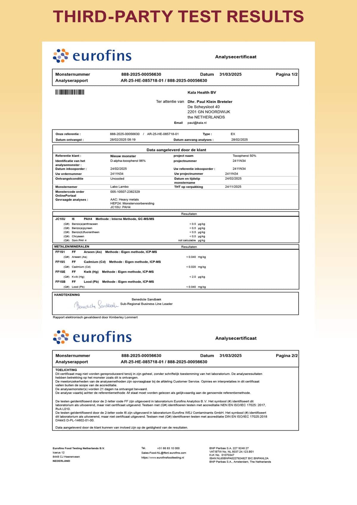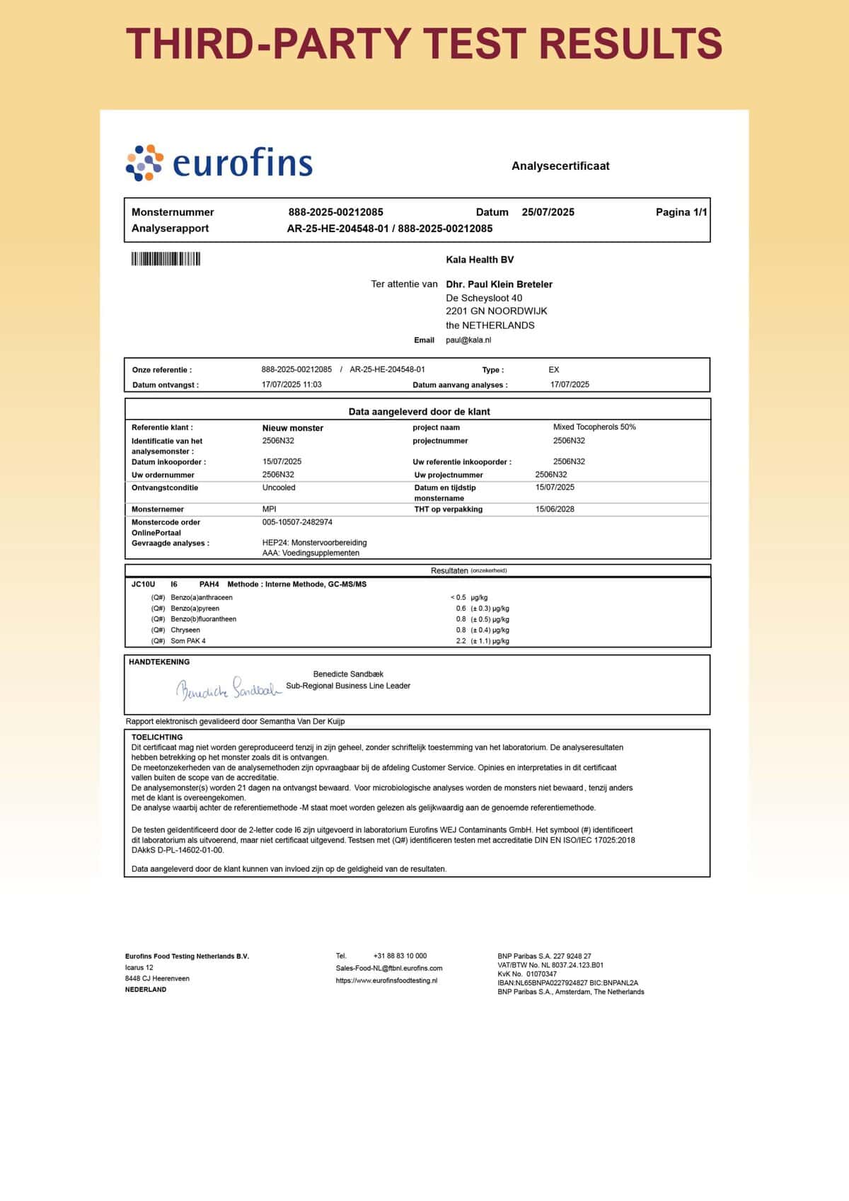 Het is onze ervaring dat bijna geen enkele leverancier van vitamine E supplementen let op verontreinigingen zoals PAK’s. Maar wij doen dat wel. Duurzaamheid en kwaliteit is voor ons van het allergrootste belang. Alle testrapporten en certificaten zijn beschikbaar voor wie ze wil inzien.