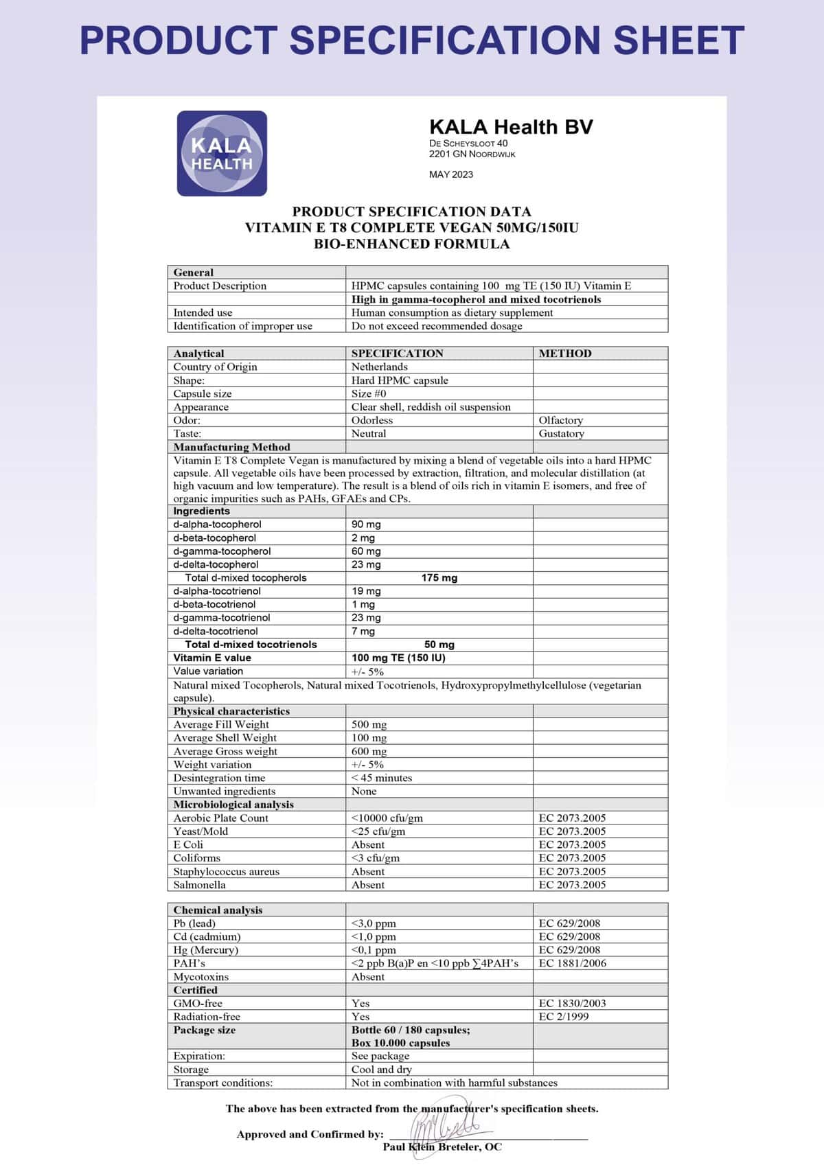 Onze vitamine E wordt gewonnen uit plantaardige oliën via moleculaire distillatie: bij hoge druk en lage temperatuur, zonder gebruik van organische oplosmiddelen. Hierdoor blijven eventuele verontreinigingen achter en worden geen giftige bijproducten gevormd. Voor de T8 Vegan gelden de volgende kwaliteitsgaranties: