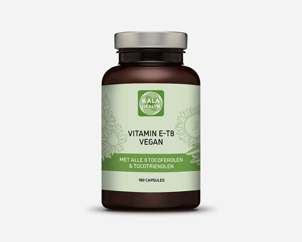 De Vitamine E T8 Vegan is de veganistische variant van Kala Health Vitamine E T8 Compleet. De samenstelling is identiek: alle vier tocoferolen en alle vier tocotriënolen in één dagelijkse capsule. Het enige, maar cruciale verschil zit in de capsule zelf.